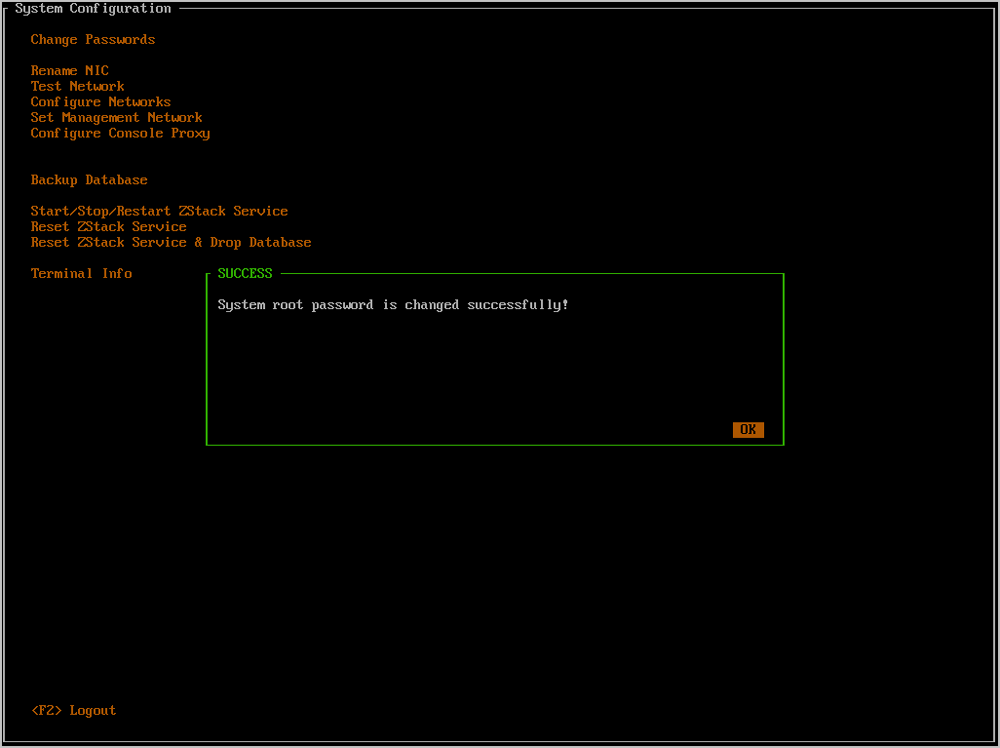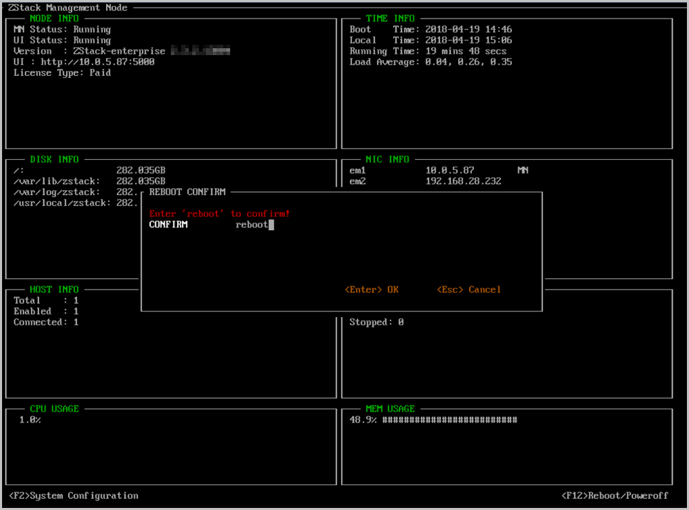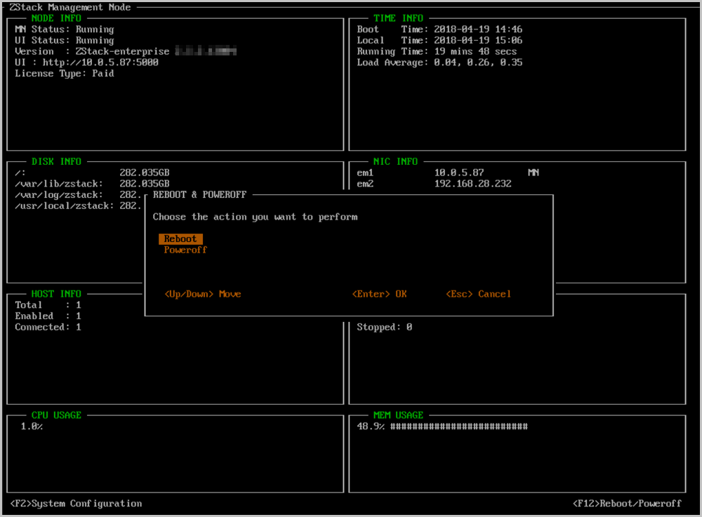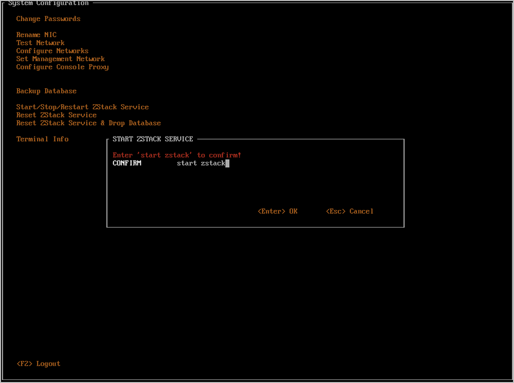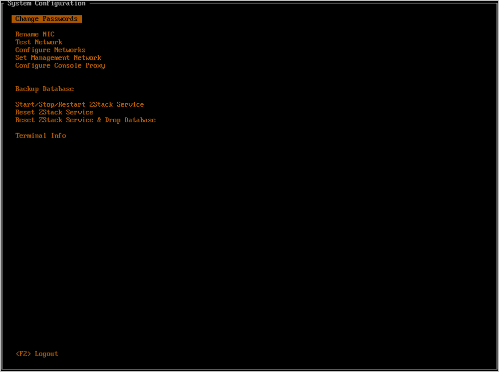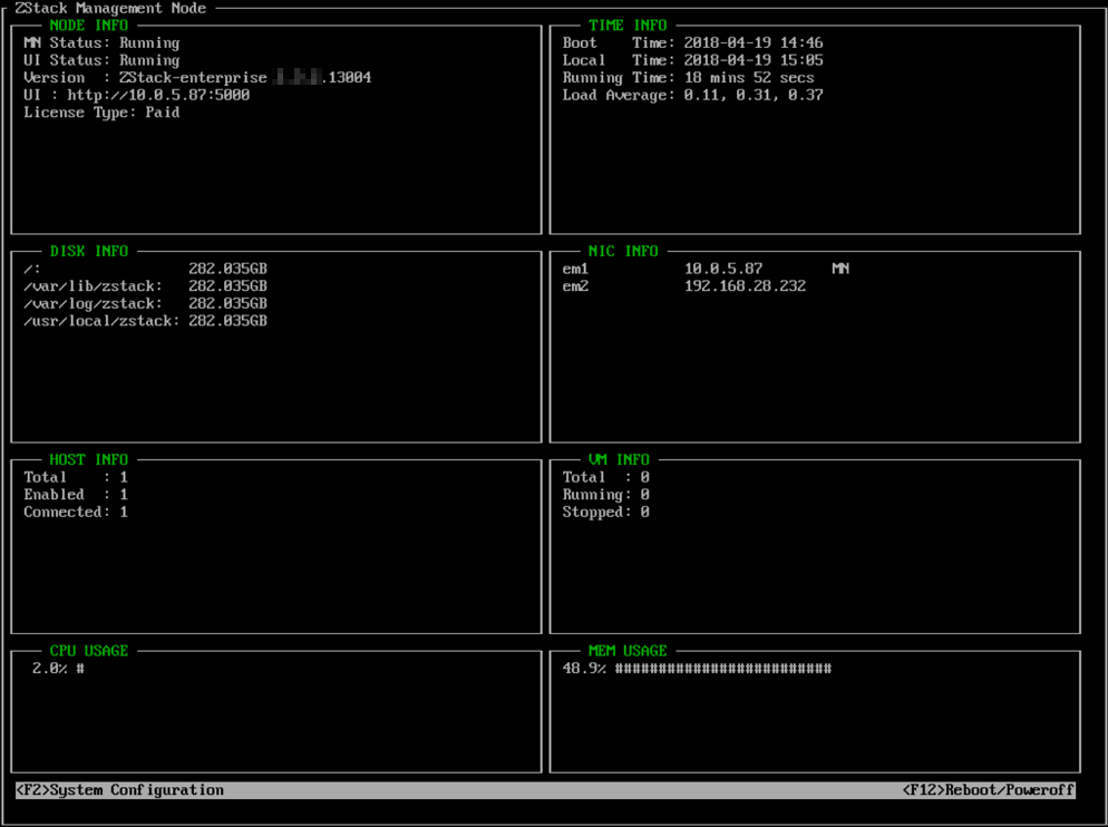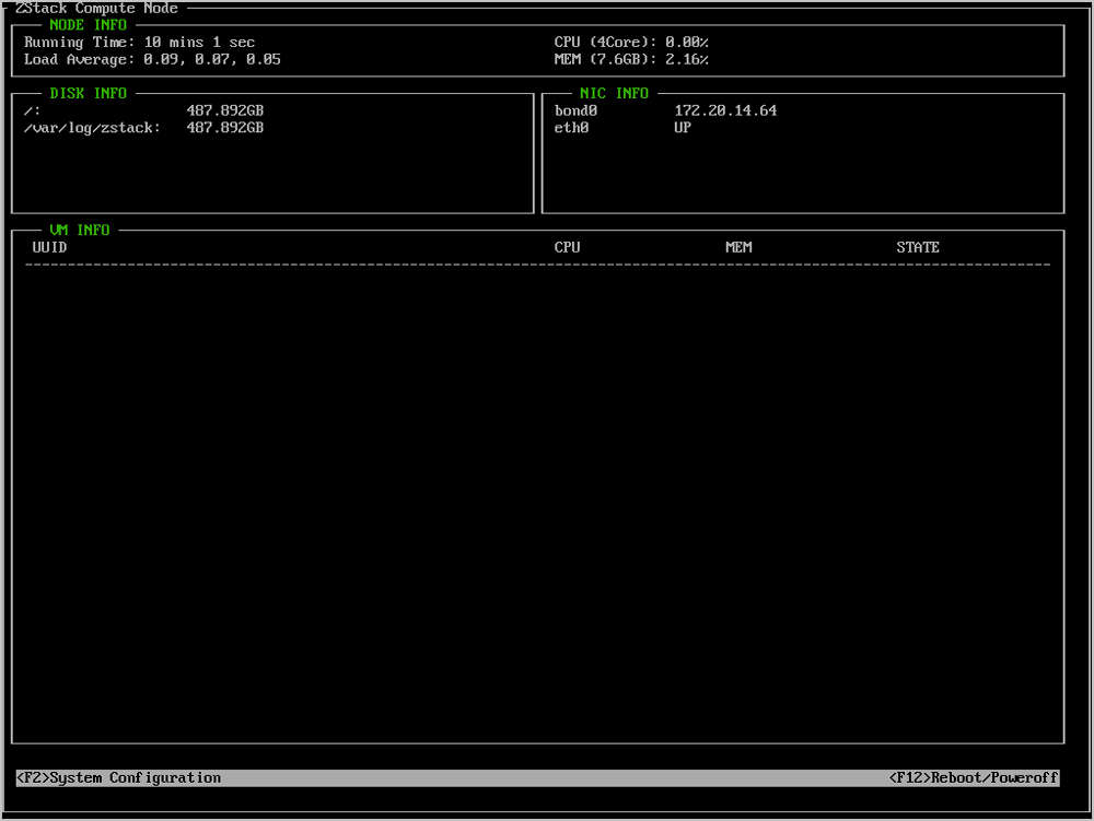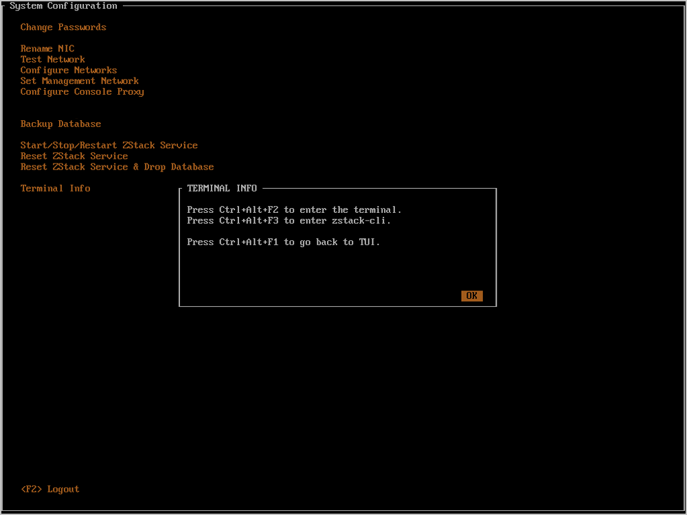 - 任何时候都可以通过按下Ctrl + Alt + F1返回ZStack TUI。