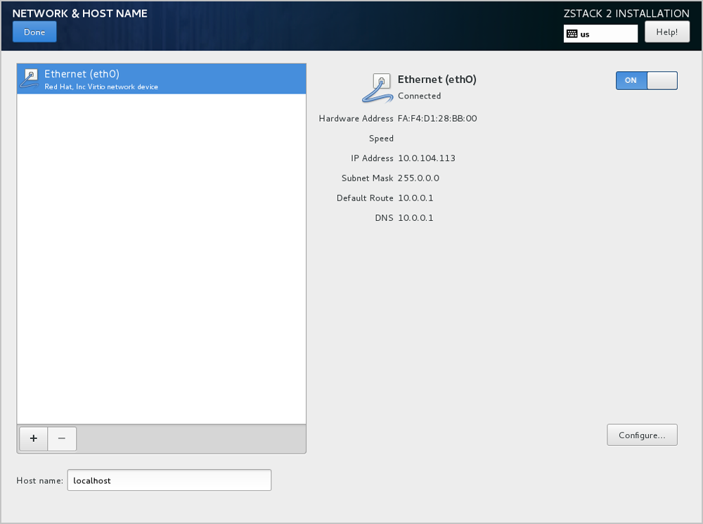 - 配置网卡。在系统安装界面,点击NETWORK & HOST NAME进入网卡配置主界面,如图 9所示。