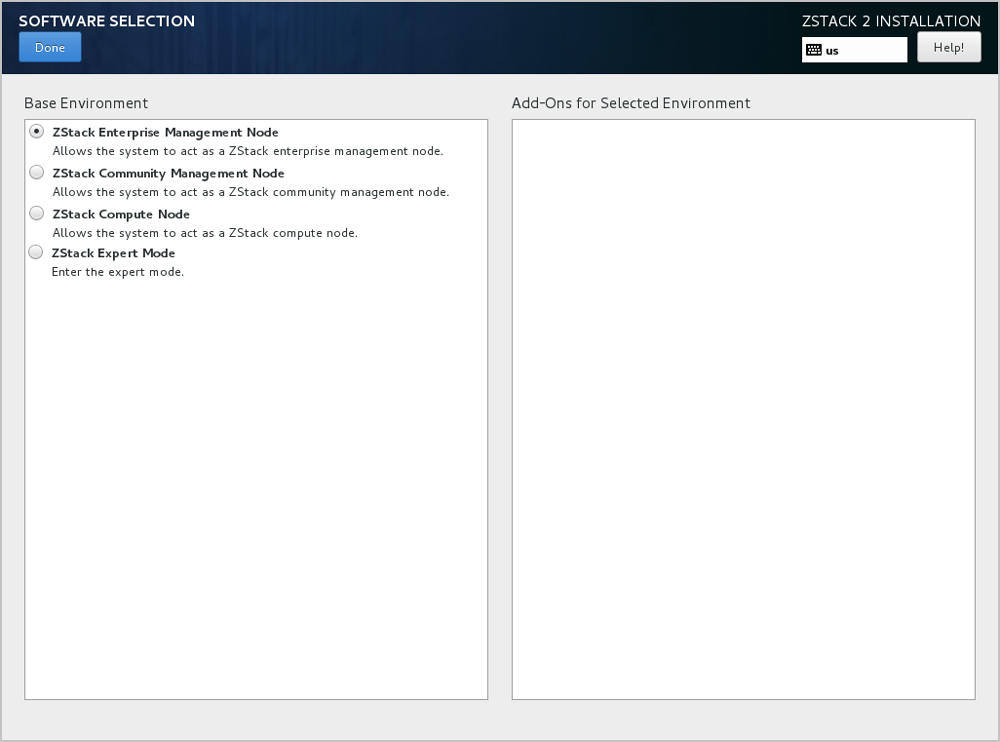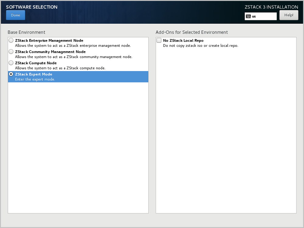 安装完专家模式后,用户可根据实际场景需求,自定义安装所需ZStack环境。