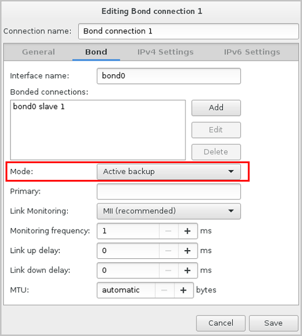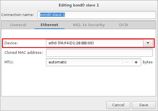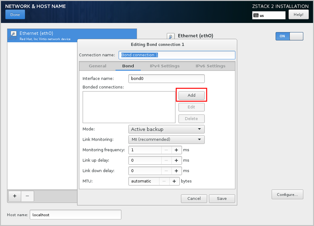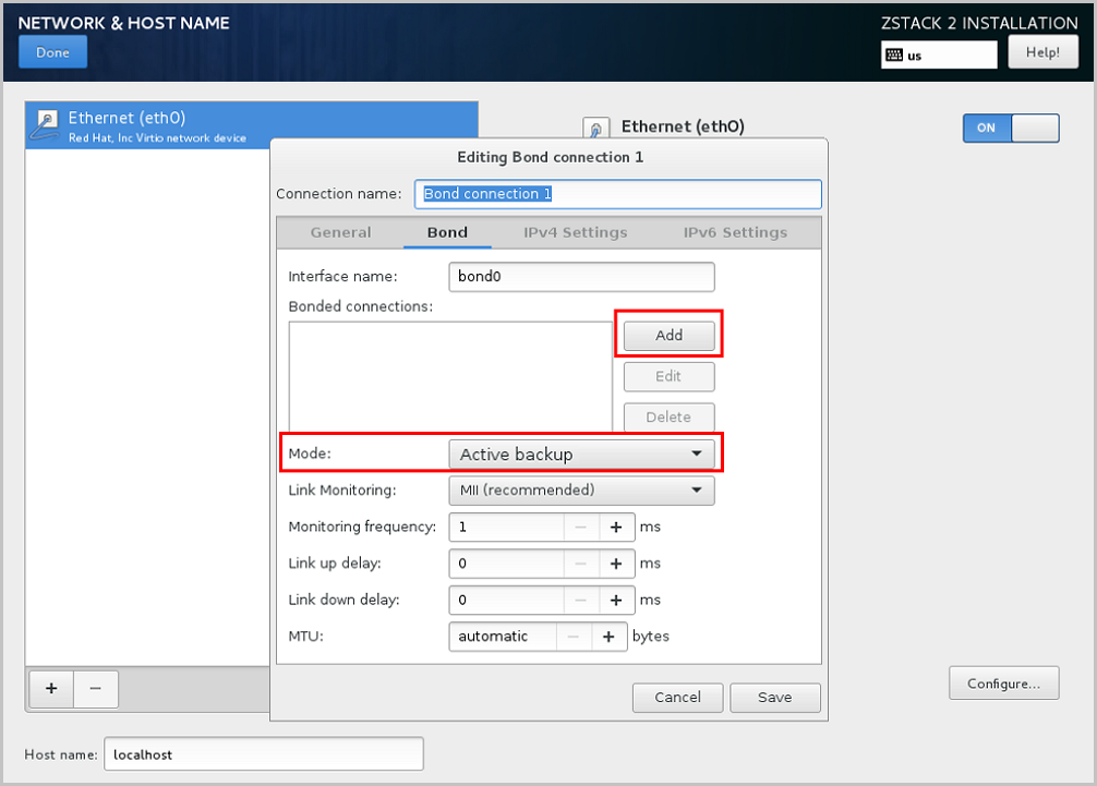 该窗口罗列了管理节点中所有处于启动状态的网卡,包括物理网卡和逻辑网卡。由于前文已做网卡归一化,这里仅需关心Bond的配置即可。