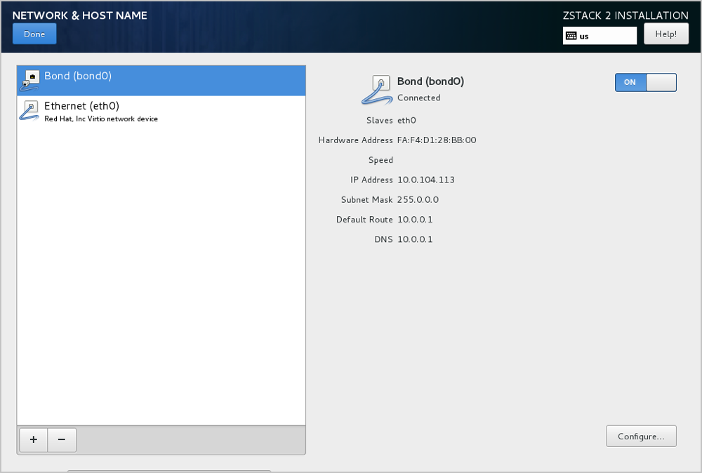 如果在实际生产环境中安装部署ZStack,建议进行网卡归一化配置,网卡归一化可进一步提高网络带宽以及网络可靠性。详细配置步骤请参考网卡归一化(可选)章节。
