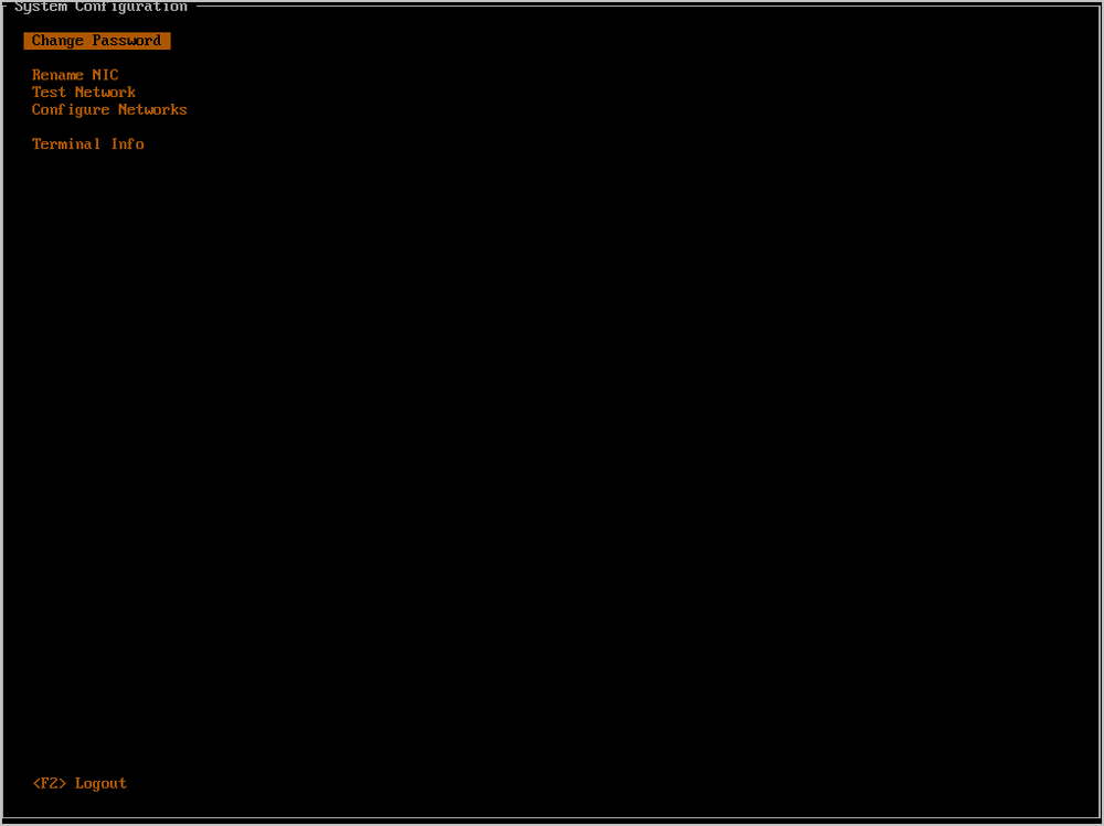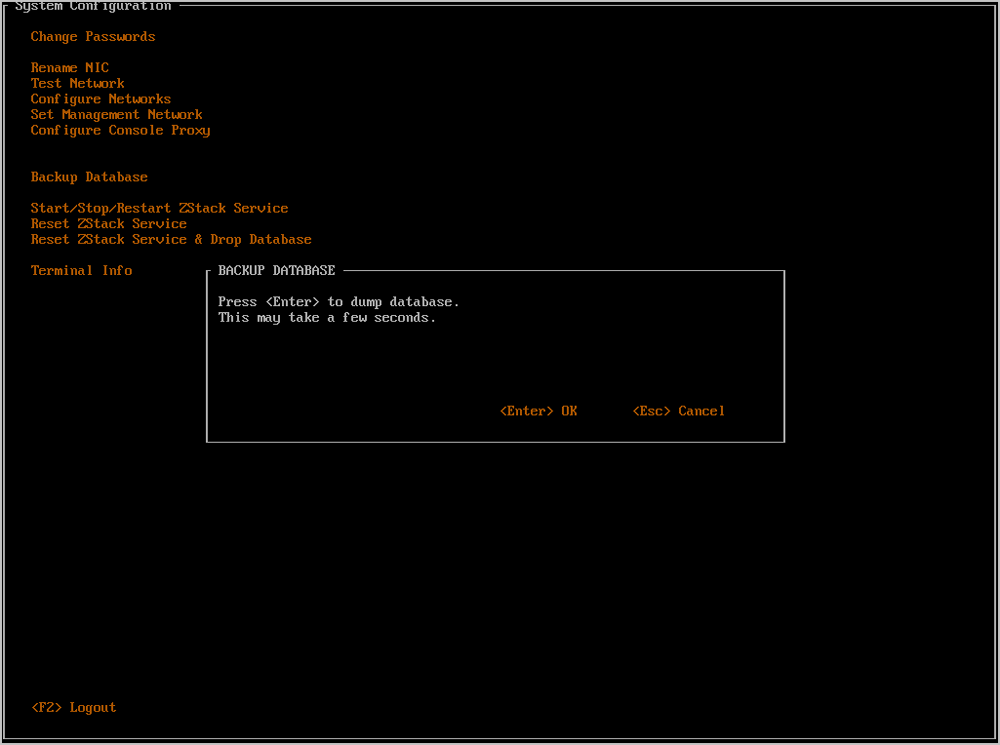 ZStack TUI为用户保留了进入终端的入口。将光标移动至Terminal Info处,回车即可看到入口信息。 - 按下Ctrl + Alt+ F2可以进入保留终端,用户可以在里面执行常规命令 ,但是请谨慎使用,以免对系统造成破坏,影响ZStack服务运行。