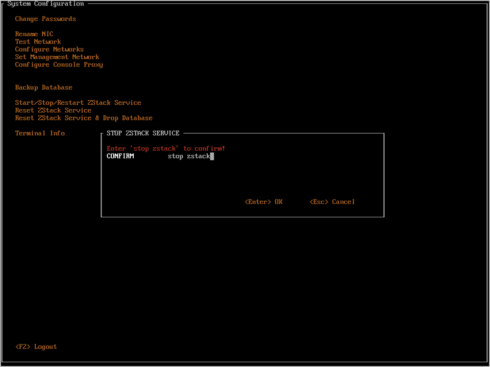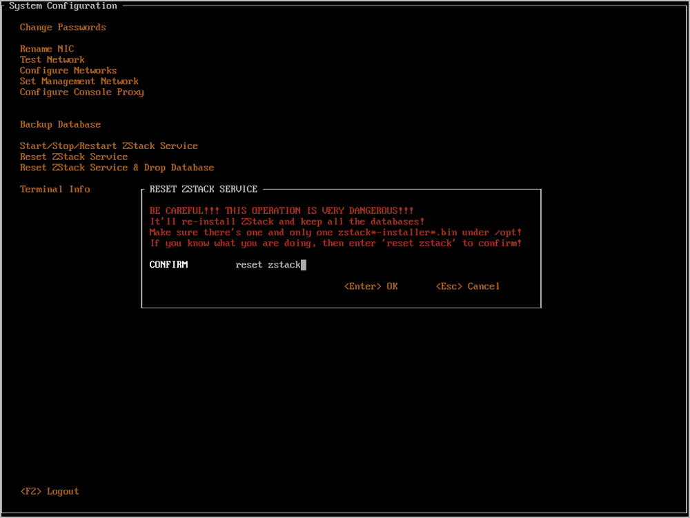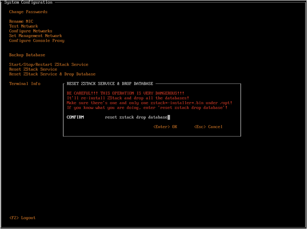 将光标移动至Reset ZStack Service&Drop Database处,按下回车,即可进入重置ZStack和数据库窗口。